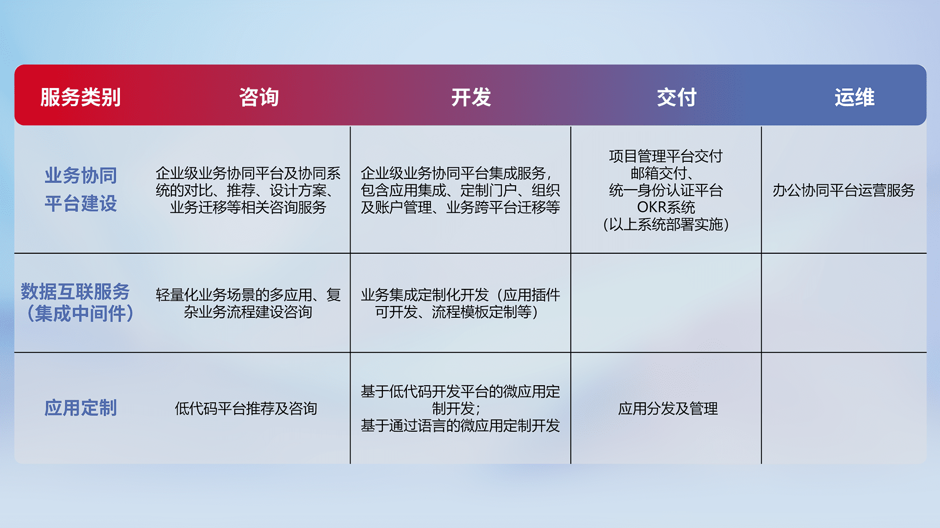 针对钉钉、、、、企微、、、IDaas等平台级产品提供产品的规划、、、方案、、、、交付、、、、定制化开发等服务,,,,实现如统一协同办公、、、智能客户服务、、混合会议管理、、、智能数据查询、、、等业务场景,,,,实现数字化转型。。