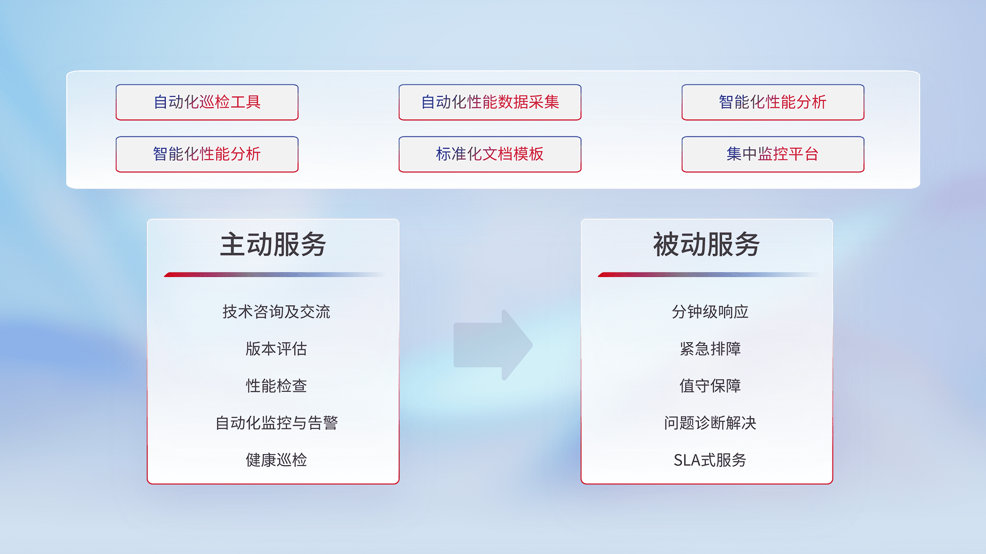 智能化工具和标准化文档,,,保障服务质量,,,,提供主动服务(包含技术咨询、、版本评估、、、、性能检查、、、、自动化监控与告警、、健康巡检)和被动服务包含(分钟级响应、、、紧急排障、、、值守保障、、问题诊断解决、、、、SLA服务)。。。